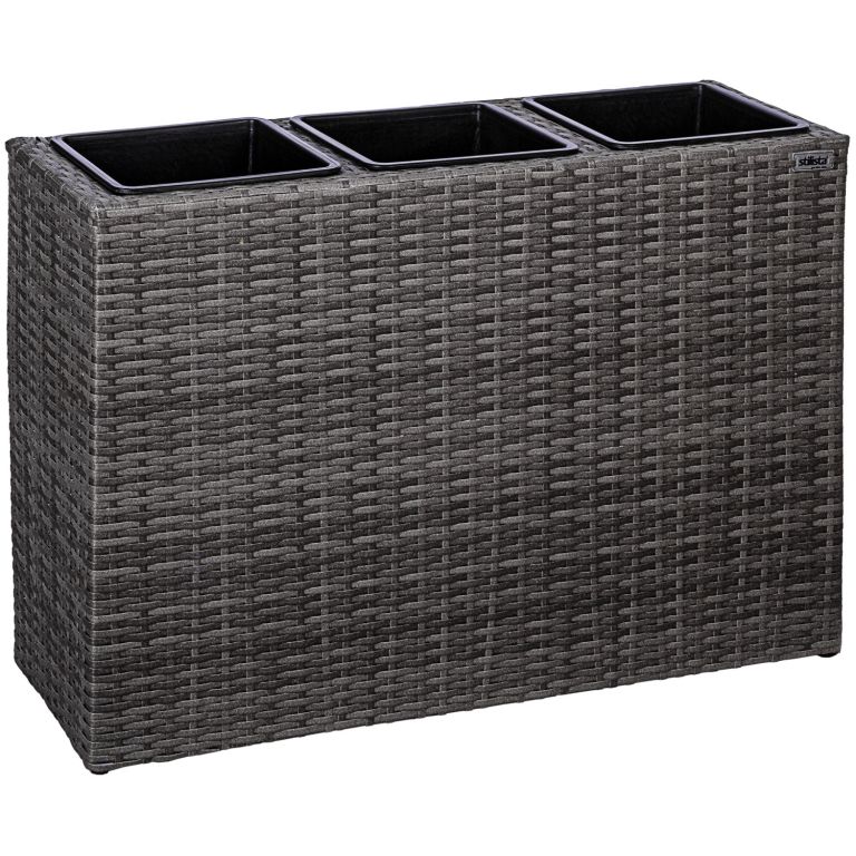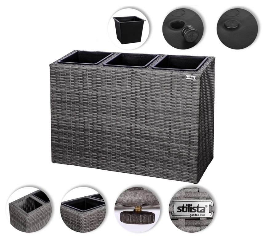 Nádherný stojan na tri črepníky je skutočným lákadlom pre Váš domov. Stojan s vnútornými kvetináči je ideálny pre výsadbu na záhrade, balkóne alebo terase, možno ho použiť aj ako rozdeľovač miestností. Materiál Vás presvedčí svojimi vynikajúcimi vlastnosťami: je odolný voči poveternostným vplyvom, UV žiareniu, odpudzuje nečistoty a ľahko sa čistí. Odnímateľné vnútorné kvetináče sú vybavené uzatvárateľným odtokom vody, ktorý zabraňuje premokreniu.