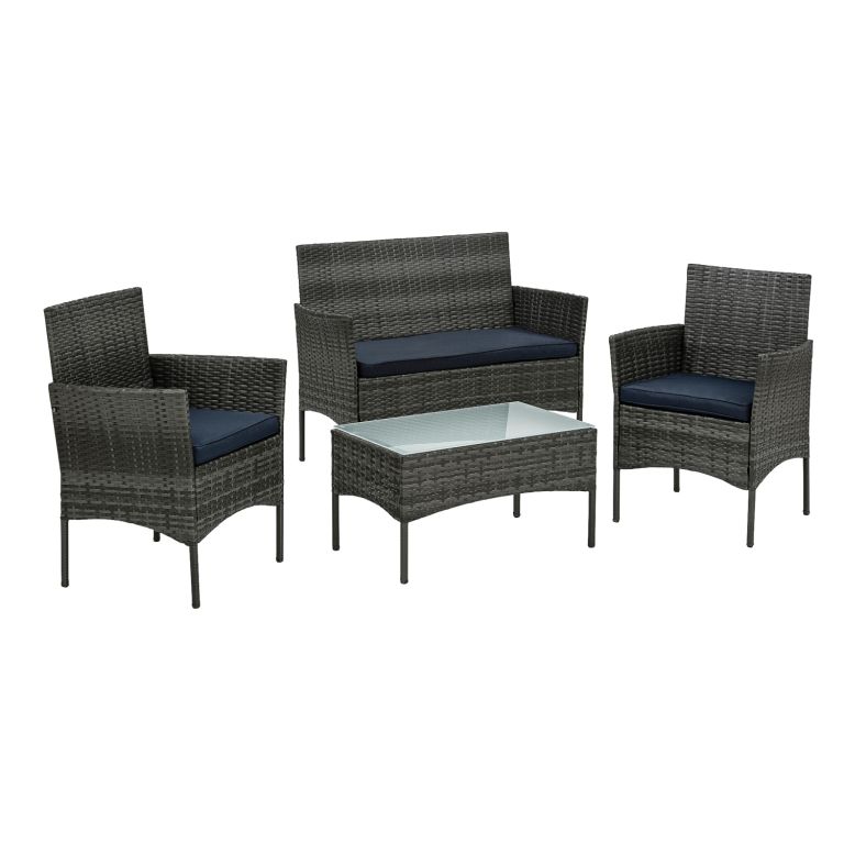 Štvordielna súprava, ktorá sa skladá zo záhradného stola, dvojmiestnej lavice a dvoch záhradných stoličiek, je vyrobená z ručne tkaného polyratanu. Náš záhradný set je vhodný na terasu, záhradu, zimnú záhradu alebo balkón a hodí sa do každého interiéru. Robustná oceľová konštrukcia je obalená polyratanovým prútím odolným proti poveternostným vplyvom a UV žiareniu. Stôl v našej obývacej izbe má krásnu dosku z matného skla. Vďaka povrchu odpudzujúcemu nečistoty sa sedacia súprava ľahko čistí, poťahy vankúšov sú navyše snímateľné, prateľné a vodoodpudivé.