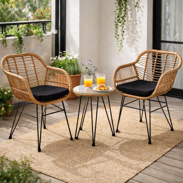 Naša balkónová súprava v ratanovom vzhľade je vhodná pre vnútorné i vonkajšie použitie. Ergonomicky tvarované kresla s 5 cm silnými sedáky poskytujú vysoký komfort sedenia. Vďaka montovatelným vyrovnávacím skrutkám na nohách stoličiek a stola je možné veľmi ľahko vyrovnať nerovnosti podlahy. Robustný rám záhradného nábytku je vyrobený z pozinkovaného a práškovo lakovaného kovu, ľahko udržiavateľné prútie je vyrobené z vysoko kvalitného polyratanu.