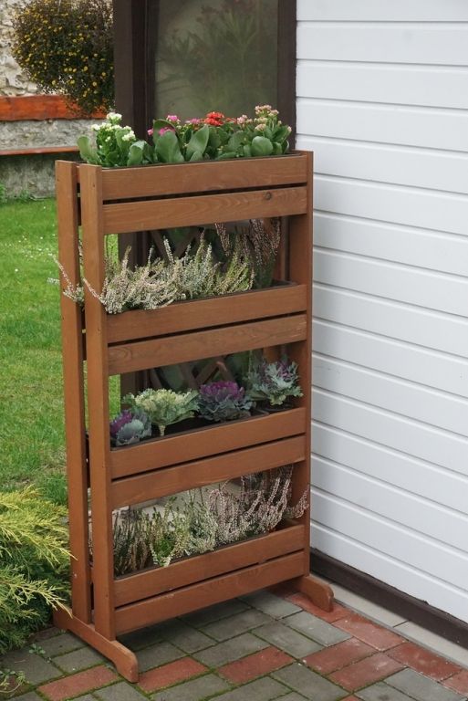 Drevený kvetináč z borovicového dreva v hnedej farbe. Stojan na kvetináče možno umiestniť na záhradu či akúkoľvek terasu.