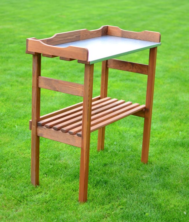 Stolík pre výsadbu z borovicového dreva a kovovej dosky. Vďaka kovovej doske je stolík ideálnym riešením pre výsadbu a presádzanie rastlín - jednoduchá údržba a stály materiál.