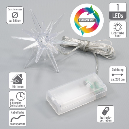 Úspora energie: Nízka spotreba energie LED diód je tiež šetrná k vašej peňaženke. Integrovaný je praktický časovač. Nastavte dobu svietenia na 6 hodín a potom 18-hodinovú prestávku. Nemusíte ho teda zapínať za súmraku alebo premýšľať o jeho vypnutí uprostred noci. Časovač a funkcie nepretržitého svietenia sú voľne voliteľné. Trieda ochrany IP20 zaisťuje ochranu a bezpečnosť. Možnosti použitia: Rôznofarebnú svietiacu hviezdu je možné použiť univerzálne, či už v obývacej izbe, zimnej záhrade, večierkovej miestnosti, na vonkajšej strane reštaurácií a barov, na terase, na záhrade alebo na akciách ako je napr. svadby, narodeniny alebo výročia, svetelný zdroj upúta pozornosť všade. Doplňte svoju vianočnú výzdobu o ďalšie skvelé zimné vianočné svetelné dekorácie, ako sú svetelné reťaze, svetelné stromčeky, svetelné siete, svetelné závesy, LED vetvy, čačky, hviezdy, soby, lucerny a sviečky z nášho sortimentu.