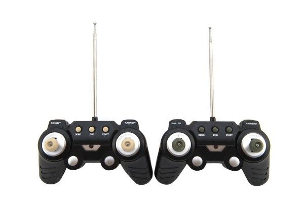 Zahrajte si na tankovú bitku. Každý tank vydáva zvuky, strieľa, otočná veža sa otáča o 360 stupňov a svieti. Kto stratí všetky "životy", pre
