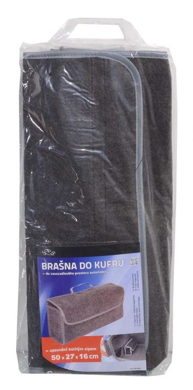 Univerzálna textilná taška, určená predovšetkým do batožinového priestoru osobného automobilu. Uzatvárateľná na suchý zips, ľahko prenosná vďaka uchu na hornej strane. Pásy suchého zipsu na zadnej strane pre ľahké prichytenie do batožinového priestoru automobilu.