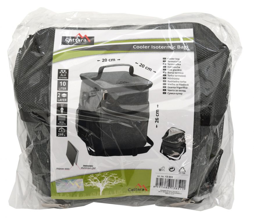 Termotaška s objemom 10 l vhodná na výlety, piknik, ale aj do auta a na nákupy. Termotaška je vybavená termoizolačnou fóliou a kvalitným zipsovým uzáverom. Vnútorný priestor termotašky je ľahko umývateľný a zároveň nepriepustný. Potraviny uložené v termotaške zostávajú vychladené po dlhú dobu. Okrem hlavného termoizolačného priestoru je taška z čelnej strany vybavená vreckom na drobnosti a na bokoch sieťovými vreckami pre ďalšie príslušenstvo.