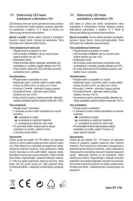 LED tester je určený pre rýchle vyhodnotenie stavu autobatérie a vyhodnotenie funkcie dobíjacej sústavy (alternátora) automobilov s napätím 12 V. Tester je vhodný pre všetky typy olovených akumulátorov.