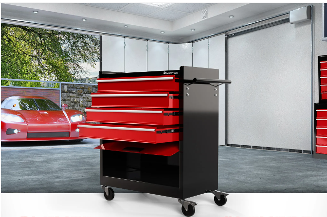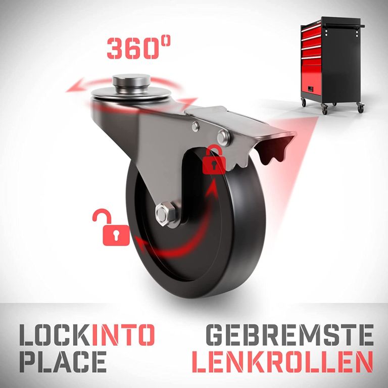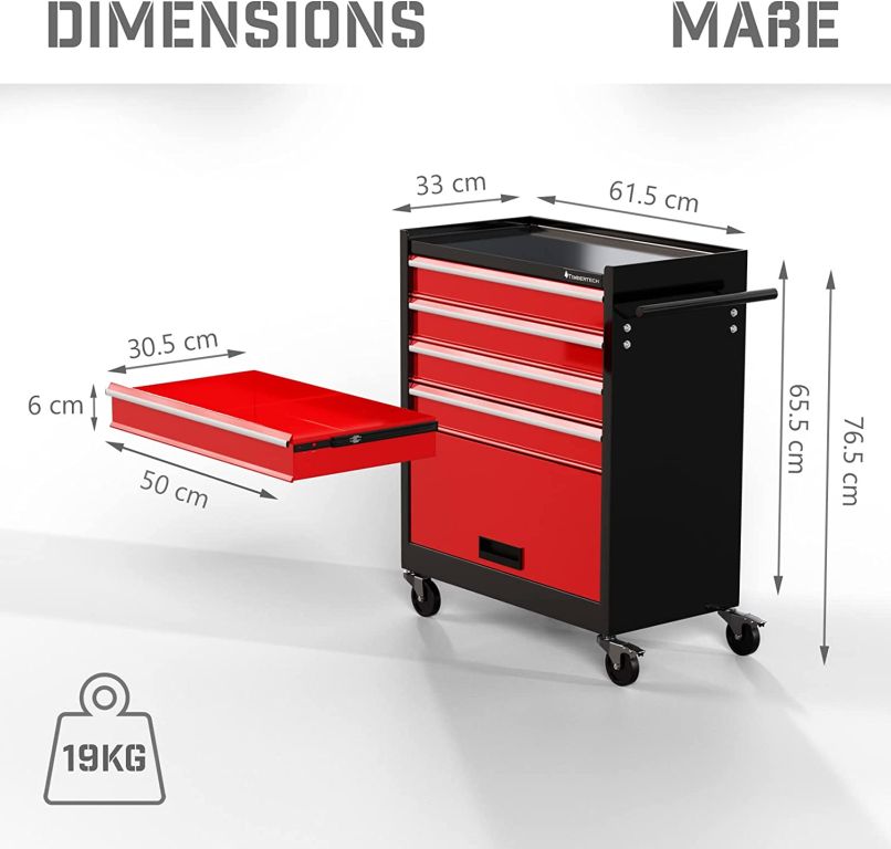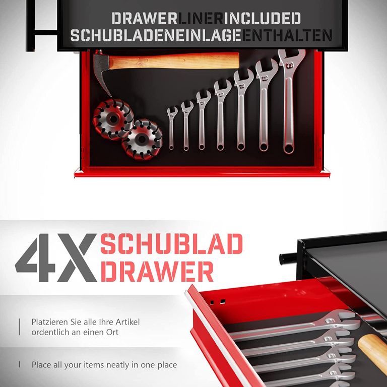 S týmto vozíkom na náradie môžete udržiavať poriadok v dielni alebo na pracovisku. Tento pojazdný dielenský vozík je vyrobený z odolnej a robustnej ocele a bude vám slúžiť mnoho rokov. Praktický montážny vozík sa skladá zo štyroch zásuviek a jednej priehradky. Polička poskytuje ďalší priestor pre usporiadanie často potrebného náradia.