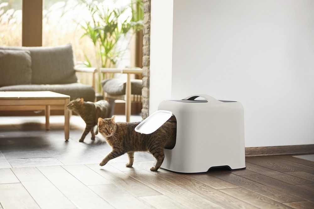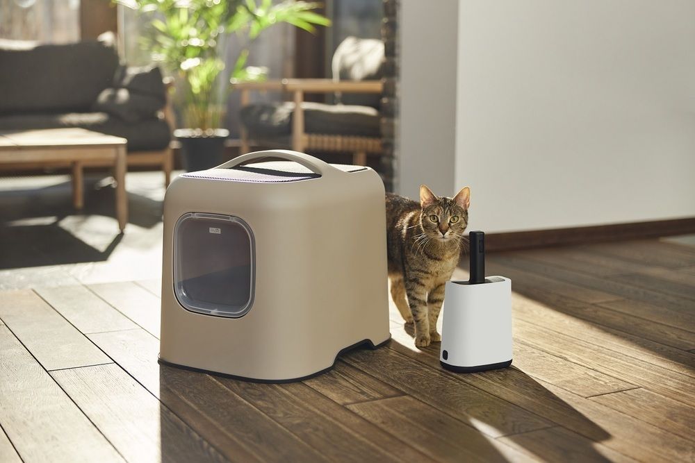 Moderná toaleta pre mačky s magnetickými dvierkami a filtrom, vyrobená z recyklovaného plastu.