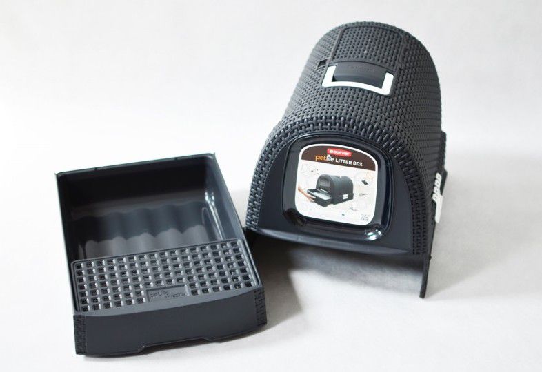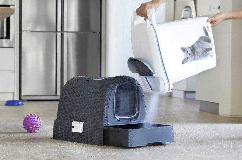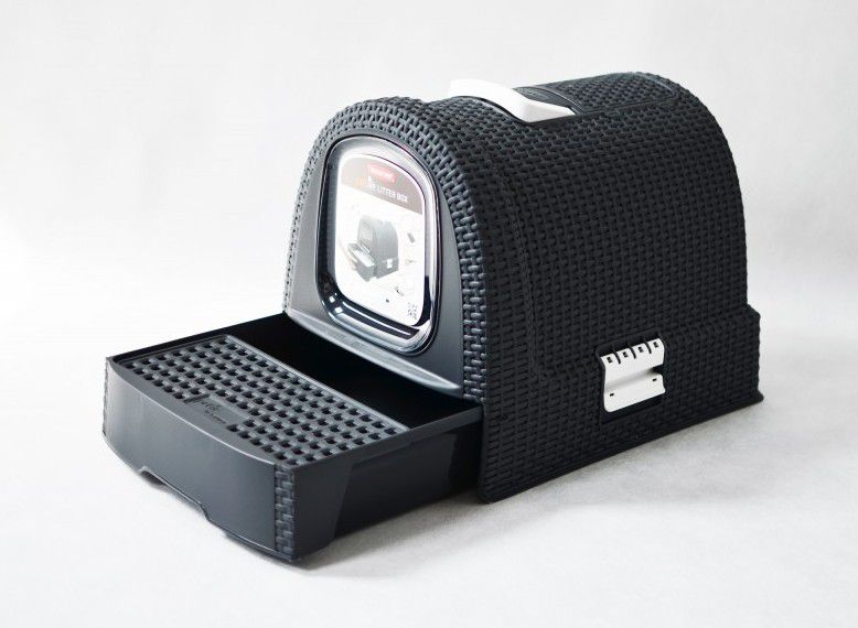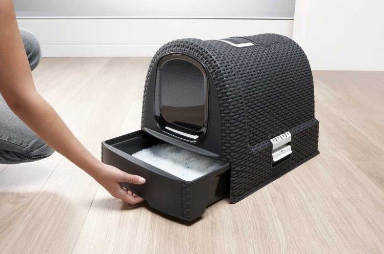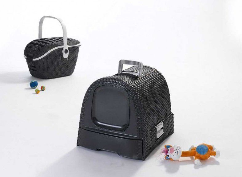 Elegantní toaleta pro kočky (šedé barvy), toaleta tak nepůsobí rušivě v interiéru.Krásný design v ratanovém stylu.Boční klipy pro jednoduché otevření při čištění, výsuvná spodní zásuvka na podestýlku.Dvířka jsou výklopná a v horní části toalety je filtr, který zachytí zápach.Součástí je lopatka na čištění steliva a předložka.Snadno se přenáší díky rukojeti.