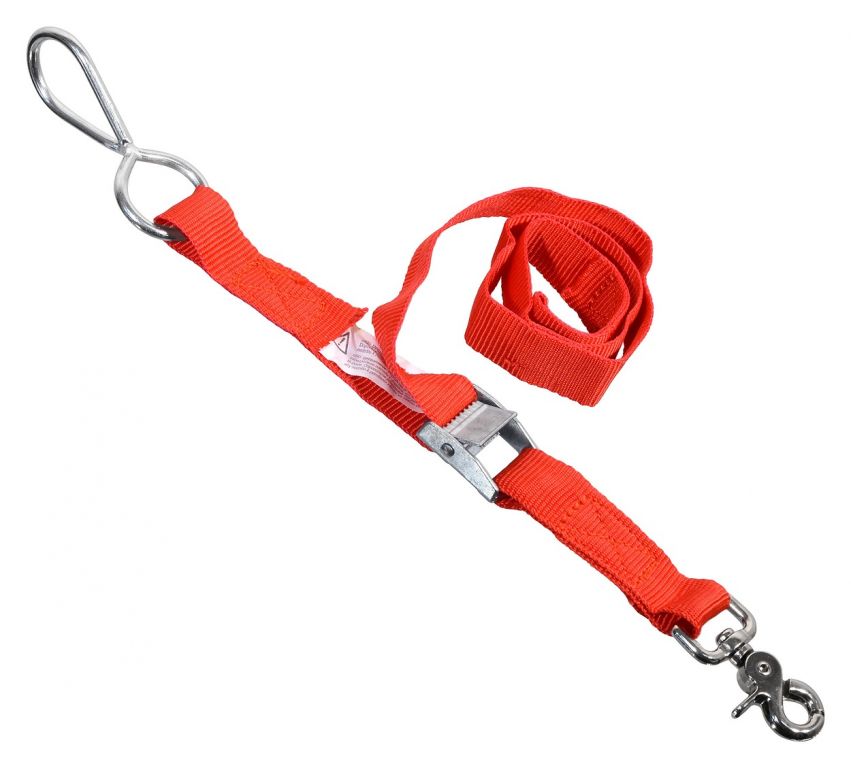 Popruh je vybavený okom na upnutie do jednej a karabínou do druhej časti zámku dverí na riadne dotiahnutie.