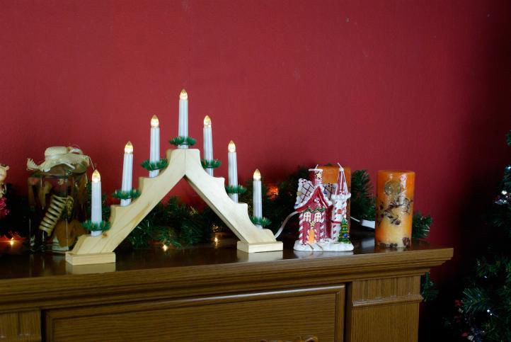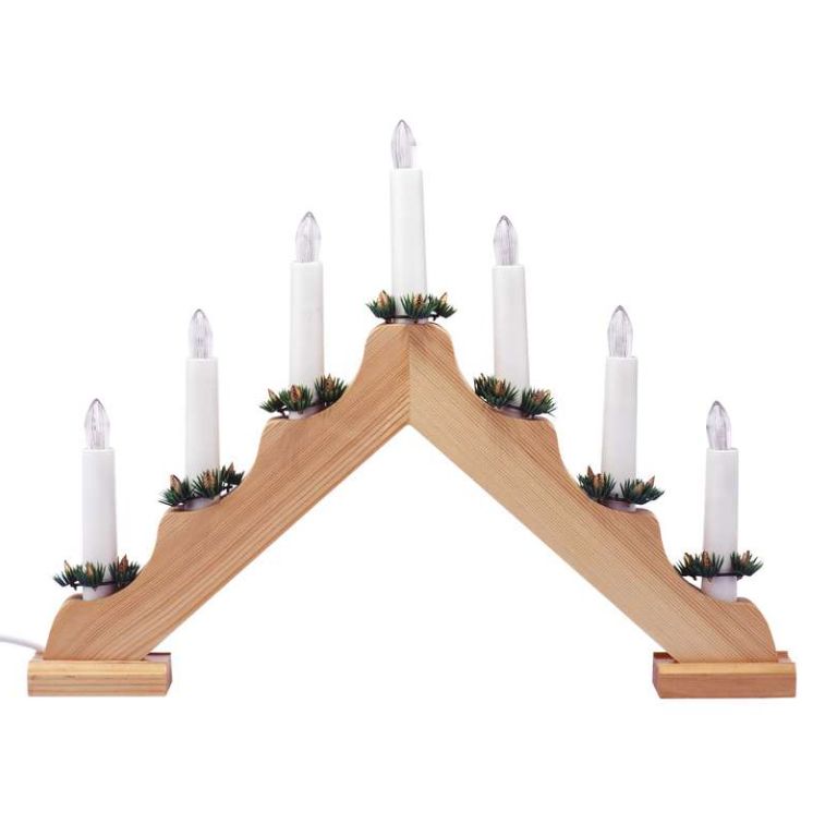 Štýlová vianočná izbová dekorácia - klasický svietnik. Svietnik obsahuje 7 LED diód vyžarujúcich teplé biele svetlo. Každá sviečka má na svojom konci umelú ihličnatú ozdobu. Svietnik je napájaný prostredníctvom kábla z el. zásuvky.