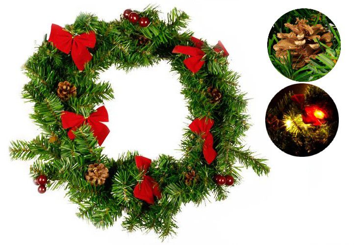 Užite si Vianoce so všetkým, čo k nim patrí a vykúzlite vianočnú atmosféru aj u Vás doma! Tento klasický veniec s červenými mašľami, šiškami a svetielkami vnesie to správne čaro. LED diódy vo venci sú napájané batériami, takže nie ste obmedzovaný napájacím káblom a veniec môžete pohodlne umiestniť do okna, nad kozub, pod police alebo na dvere.