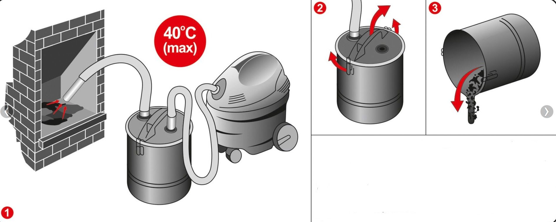 Upozornenie: Nepoužívajte pre kvapaliny. Teplota popola nesmie prekročiť + 40 ° C. Pred každým použitím skontrolujte nádrž a vyčistite filter prúdom stlačeného vzduchu. V prípade nadmerného znečistenia vymeňte filter za nový.