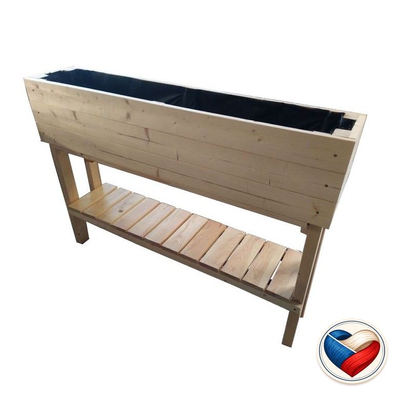 Záhon je vyvýšený pre ľahšiu prácu bez ohýbania sa a kľačania. Je vyrobený z 20 mm hrubého materiálu a nohy sú hrubé 40 x 60 mm. Záhon je povrchovo ošetrený ekologickým náterom, proti hnilobe a poveternostným vplyvom. Police na uloženie náradia na pestovanie a sadbu. Geotextília je súčasť balenia produktu a slúži na oddelenie zeminy od záhona. Zo spoda má záhon plastové klznice pre lepšiu stabilitu a aby drevené nohy neboli v kontakte so zemou. Záhon sa hodí na pestovanie na balkóne, alebo pri dome na terase.