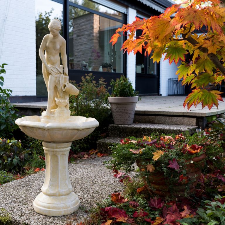 Romantická fontána sa stane obľúbeným doplnkom Vašej záhrady a zároveň poslúži aj ako štýlová fontánka s pitnou vodou pre vtáky. Fontána je vyrobená z polyresinu, ktorý je veľmi odolný. Vodu prečerpáva čerpadlo s tichým chodom.