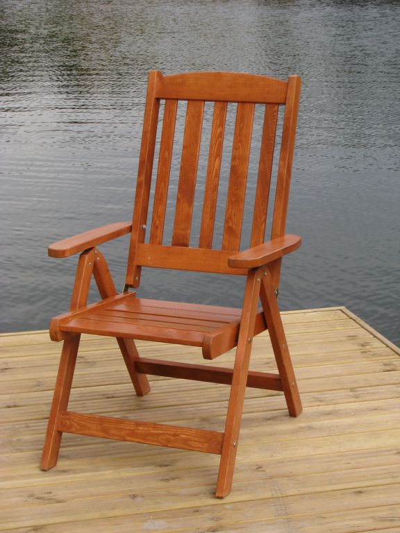 Polohovacie záhradné kreslo z lakovaného borovicového dreva.