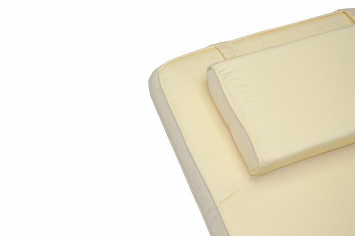 Elegantné ležadlo zo stabilného a počasiu odolného teakového dreva. Lehátko má odnímateľnú nožnú časť a polstrovanie v béžovej farbe.