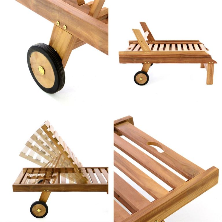 Ležadlo je vyrobené z upraveného teakového dreva s dvomi gumovými kolieskami. Vďaka päťstupňovému nastaviteľnému operadlu sa môžete rýchlo presunúť z polohy ľahu do polohy sedu. Sada obsahuje ľahko udržiavateľnú podložku zo štruktúrovaného polyesteru s 11 segmentmi a vankúšom pre pohodlný spánok. Poťah je stabilný, vodoodpudivý, umývateľný a odnímateľný pre jemné čistenie. Teakové drevo je veľmi odolné voči poveternostným vplyvom, a je preto ideálne pre vonkajšie použitie. Ležadlo je vyrábané ručne, preto je každý kus originálny.