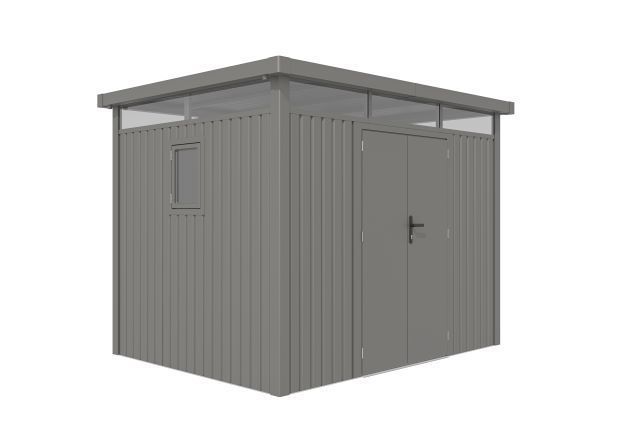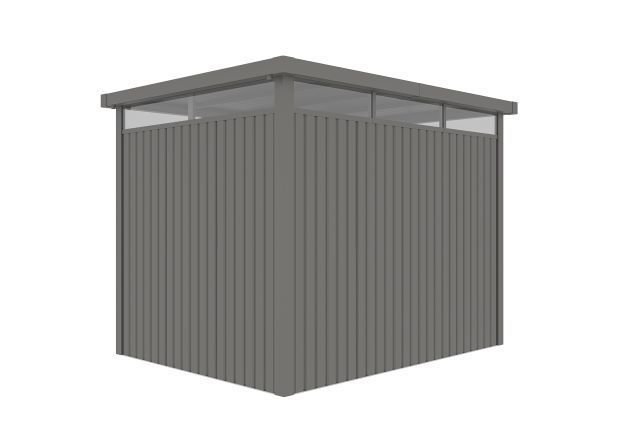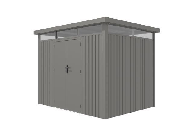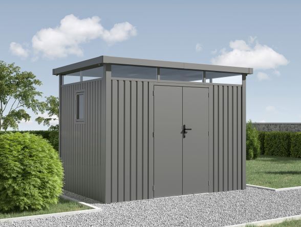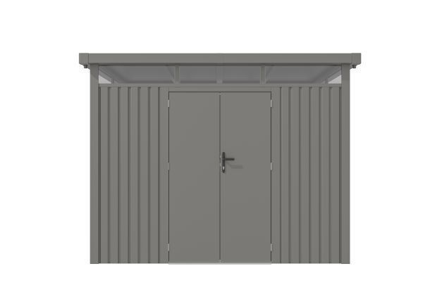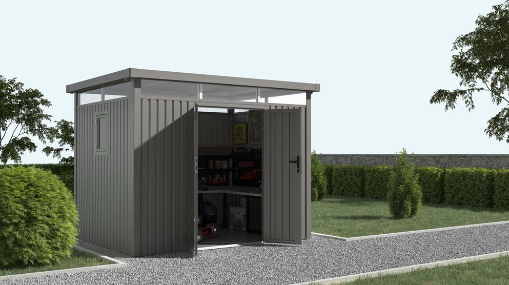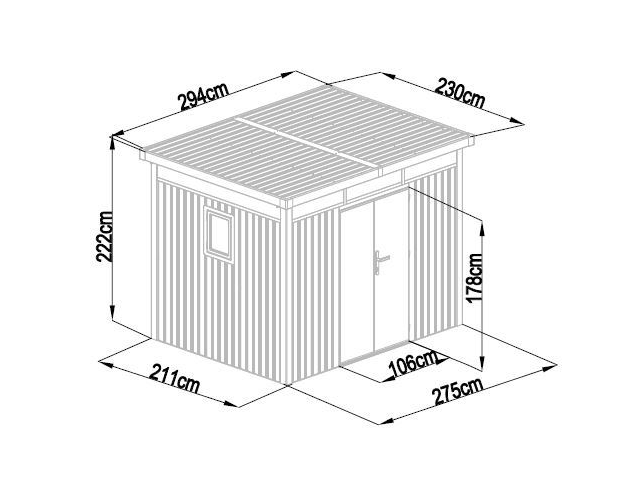 Záhradný domček v modernom dizajne sa hodí do každej záhrady. Domček má dvojité krídlové dvere, ktoré je možné uzamknúť. Vyrobený z kvalitných oceľových plechov hrúbky 0,4 mm a kvalitného rámu spozinkovanej ocele hrúbky 0,5 - 1,2 mm. Maximálne zaťaženie strechy snehom je 60 kg/m2. Jedno otvárateľné okno. Presvetlené vrchné časti panelov. Systém rýchleho odvodu dažďa.