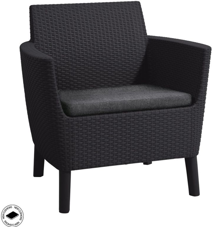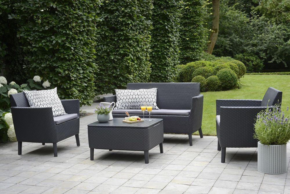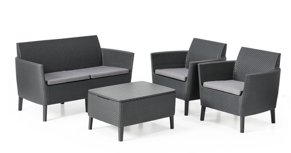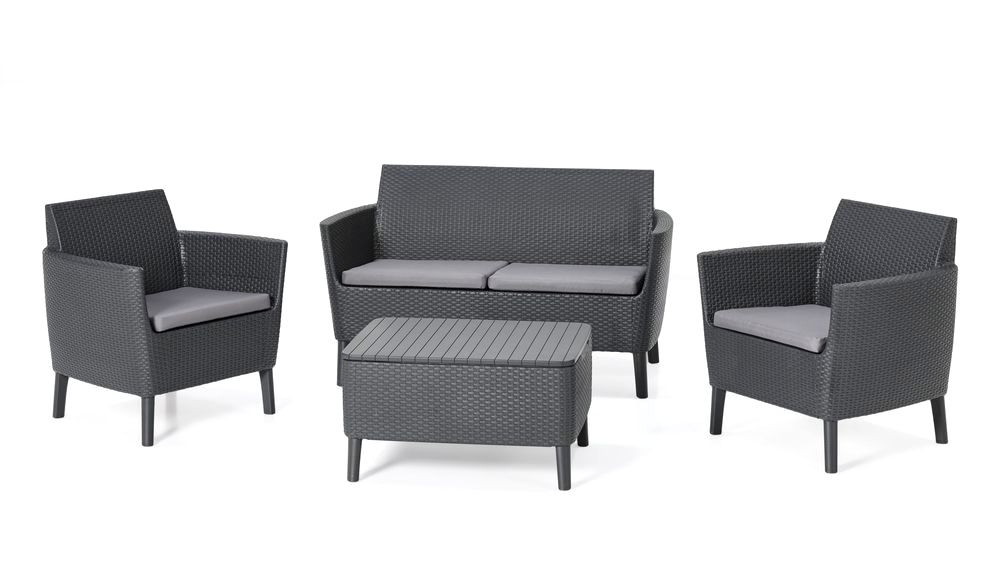Salemo je úplná novinka na trhu, súprava ktorá skvele vynikne v modernom aj retro štýle bývania. Jedná sa o elegantný set v imitácii ratanu, skladajúci sa z dvoch kresiel, dvojitého gauča a stola, ktorý navyše slúži ako úložný box. Produkt je dodávaný s pohodlnými vankúšmi v štýlových farbách. Ľahká a stabilná konštrukcia nábytku sa skvele hodí do exteriéru aj interiéru. Set je veľmi jednoduchý na údržbu. Výrobok je vysoko odolný proti UV lúčom a poveternostným vplyvom.