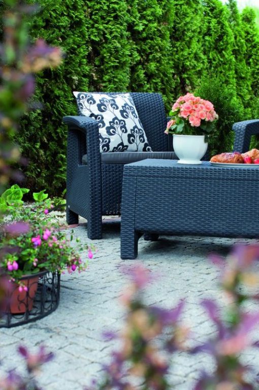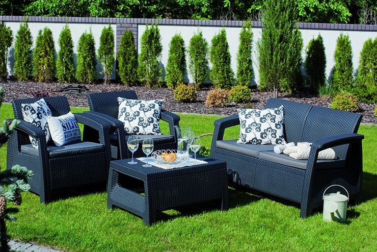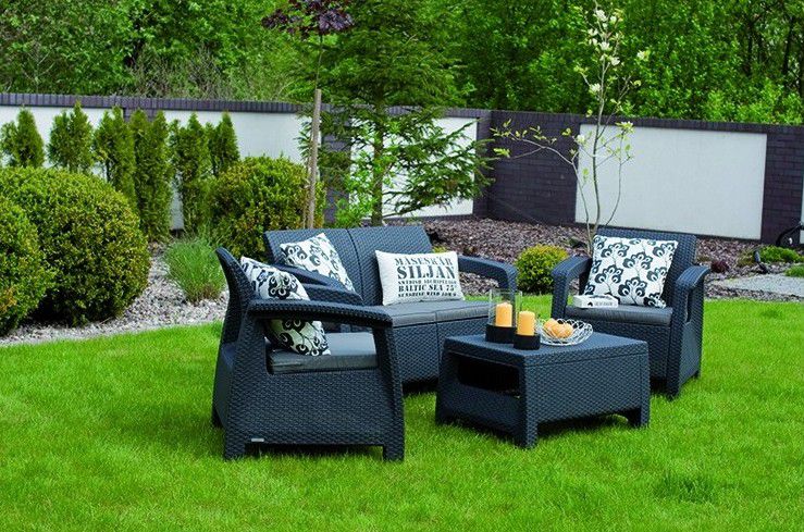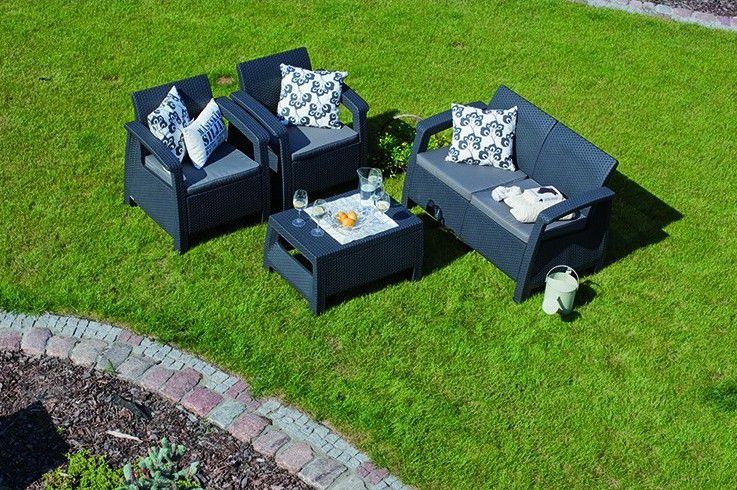 Súprava Corfu je pohodlné a moderné posedenie ako do exteréru, tak do interiéru. Súprava je vyrobená z lisovaného plastu v imitácii plochého ratanu. Set je doplnený o podušky, ktoré zaistia ešte väčšie pohodlie. Táto súprava patrí k najpredávanejším v tejto kategórii! Skladá sa z dvoch kresielok, sofy a stolíka. Jednoduchá montáž aj údržba. súprava antracit, umelý ratan plochý