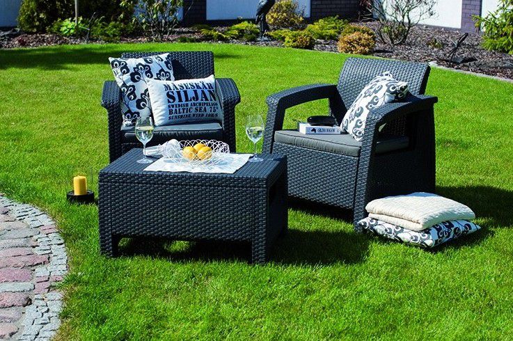 Súprava Corfu WEEKEND je menšie moderné posedenie vhodné do interiéru aj exteriéru. Súprava je vyrobená z lisovaného plastu v imitácii plochého ratanu. Set je doplnený o podušky, ktoré zaistia ešte väčšie pohodlie. Jedná sa o veľmi obľúbenú súpravu. Skladá sa z dvoch kresielok a stolíka. Jednoduchá montáž aj údržba.