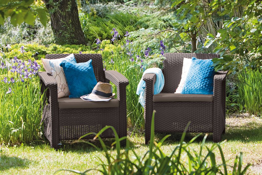 Set Corfu Duo sa skladá z dvoch kresielok. Kresielka sú z umelého plochého ratanu v hnedej farbe so sivohnedými poduškami. Záhradný nábytok z umelého ratanu je odolný voči nepriaznivému počasiu.