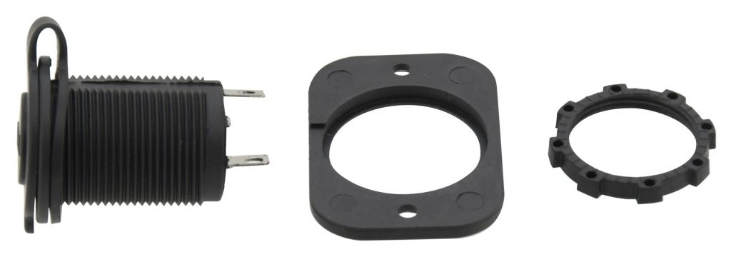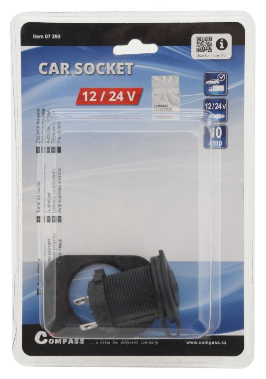 Zásuvka určená na montáž do vozidiel s napätím 12 V / 24 V. Slúži ako dodatočný slot napájania vo vnútri vozidla, v batožinovom priestore, napríklad pre autochladničku, osvetlenie atp. Za zmienku stojí gumová krytka, ktorá slúži ako ochrana pri nepoužívaní zásuvky. Montáž je jednoduchá a rýchla, zásuvka sa umiestni do predvŕtaného otvoru na určenom mieste a dotiahne sa pomocou matice zo zadnej strany, pre ešte istejšie uchytenie sa môže z prednej strany priskrutkovať pomocou dvoch skrutiek. Vďaka krytu sa do zásuvky nedostane prach.