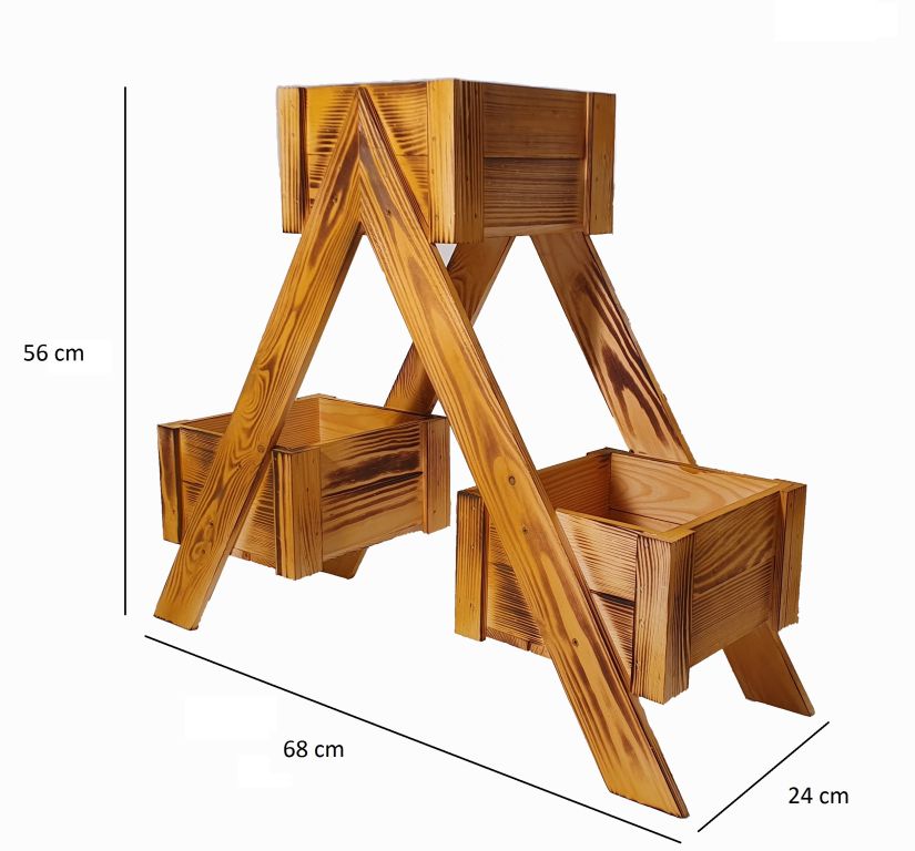 Drevený kvetináč vyrobený zo smrekového alebo borovicového dreva vrátane povrchovej úpravy olejovou lazúrou s jemným opálením. Dodávaný je zmontovaný, takže nepotrebujete žiadne náradie. Drevo je prírodný materiál, ktorý môže praskať a pracovať, tomu sa nedá zabrániť. Výrobok nie je určený na vonkajšie použitie v zimnom období, výrazne sa tým skracuje životnosť.